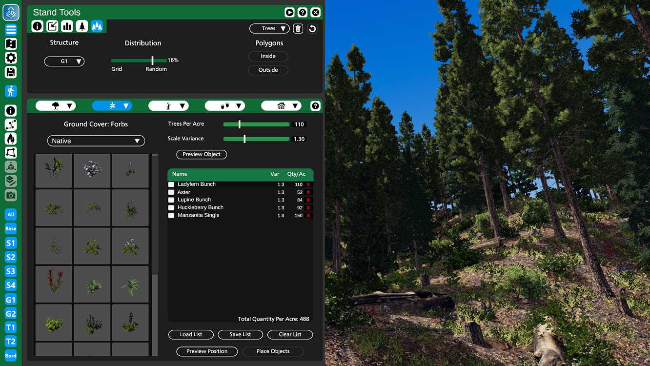 With a company history spanning more than 30 years in California forestry, we know that you would rather be in the field. As a result, we’ve created a platform that combines ease of use with unparalleled attention to detail when looking at a forest from the ground-level perspective. To use Stand Designer, you select a four acre terrain to represent a slice from a larger landscape. Then, you can populate the terrain with trees, fill in the understory, and add special objects for scale, function, or aesthetics. You can choose to quickly import data and use pre-made templates or you can customize the scene to try and match a photo, your notes, or a detailed treatment plan.