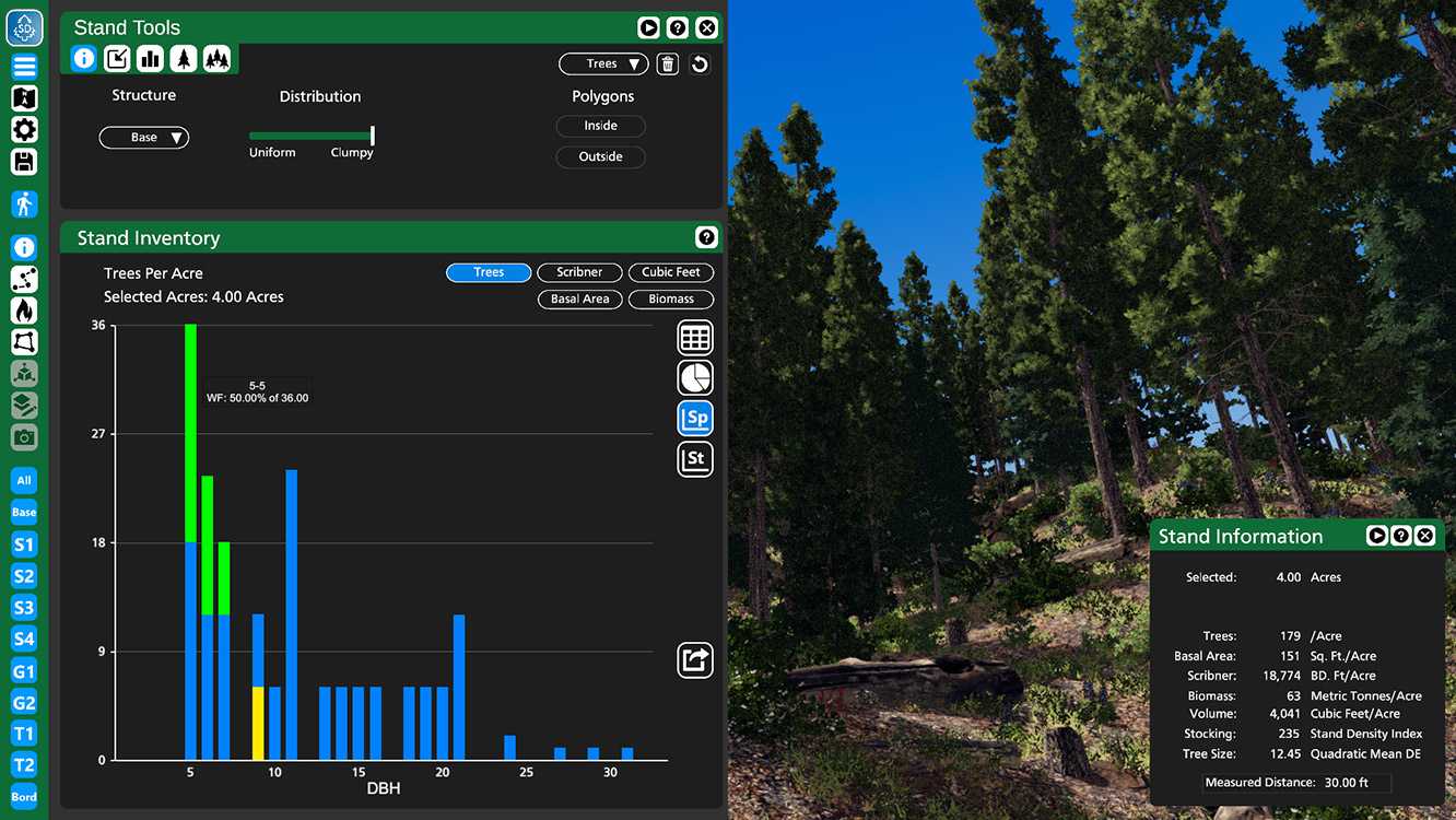 Whether you import your stand tables or build a stand from scratch, Stand Designer will estimate tree volume and biomass using FIA equations. You can click on any individual tree to get its biometric data or view data summaries in tables and graphs.